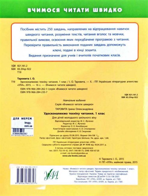 Удосконалюємо техніку читання 1 клас Вчимося читати швидко УЛА. Посібник містить 250 завдань, направлених на відпрацювання навичок швидкого читання, розуміння текстів, читання вголос та мовчки, правильної вимови, освоєння яких передбачене програмою з читання.