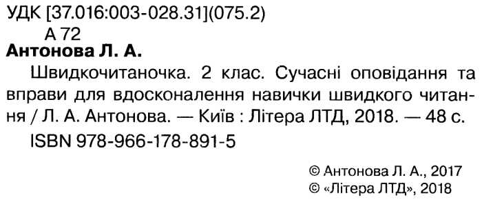 Посібник Швидкочитаночка 2 клас НУШ Авт: Антонова Л.А. Вид-во: Літера 21180