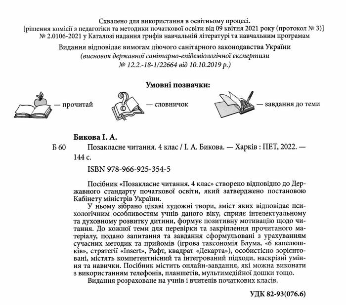 Позакласне читання 4 клас НУШ Бикова І. ПЕТ. Створено відповідно до нової навчальної програми Міністерства освіти і науки України.