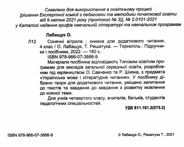 Нова українська школа Сонячні вітрила Позакласне читання 4 клас НУШ Лабащук О. Підручники і посібники. Матеріали пропонованого посібника відповідають оновленій програмі МОН України з предмета «Літературне читання» для початкової школи, вимогам Державного стандарту початкової освіти. У ньому зібрано твори для позакласного читання, запитання та завдання до них, завдання для перевірки знань учнів з кожної теми.