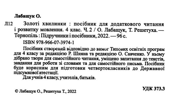Посібник для додаткового читання і розвитку мовлення Золоті хвилинки 4 клас Частина 2 НУШ Авт: Лабащук О. Решетуха Т. Вид-во: Підручники і посібники 71889