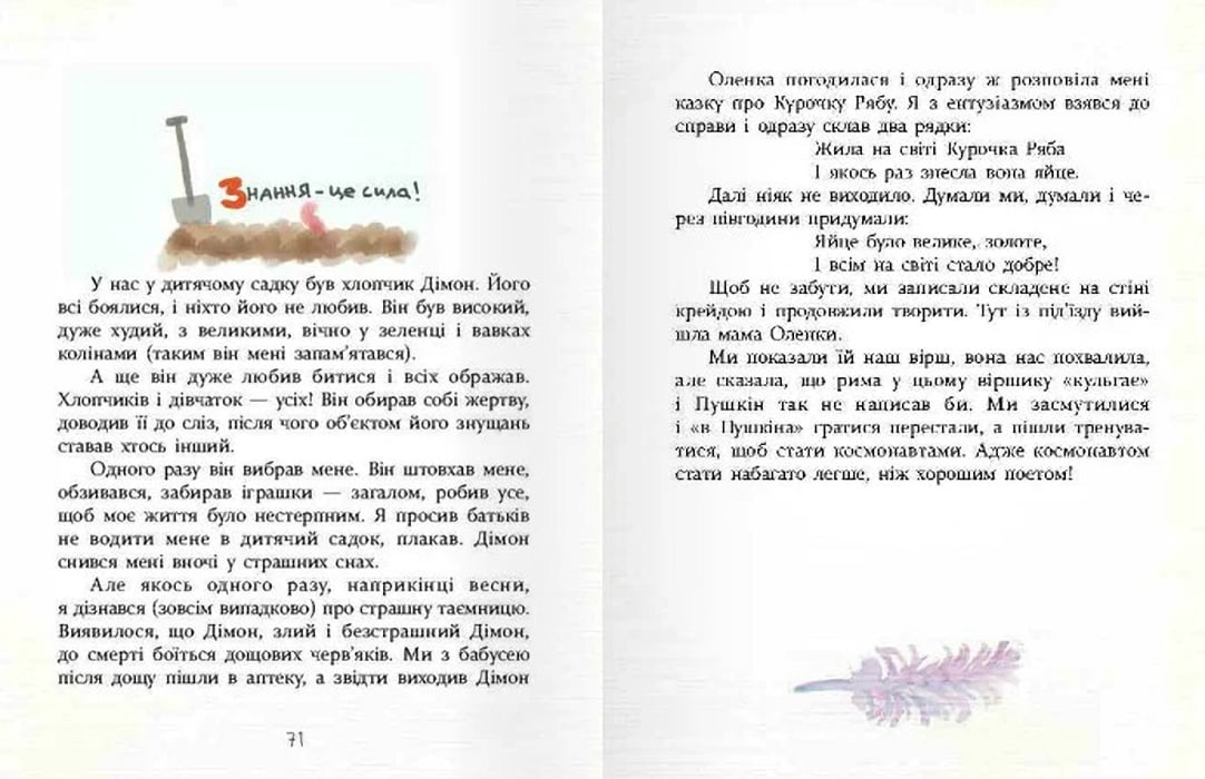 Короткі історії, які підійдуть навіть тим, хто тільки починає читати, або тим, кого потрібно зацікавити (та навіть якщо ви будете читати цю книгу дітям, то отримаєте задоволення згадуючи власні дитячі роки). Крім того, історії нагадають яким цікавим може бути дитинство без гаджетів і багате на вигадки!