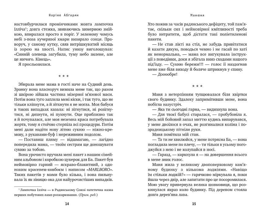 «Манюня» — світла, пронизана сонцем і запахами східного ринку та напрочуд смішна розповідь про дитинство, про двох дівчаток-підлітків — Наріне і Манюню, про грізну й добру Ба — бабусю Манюні та про їхніх родичів, які постійно потрапляють у кумедні ситуації.