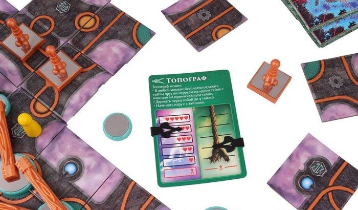 Каждый игрок получает по карте искателя приключений с особыми способностями и изображёнными шкалами износа верёвки и здоровья, а также по тайлу энергетической платформы.