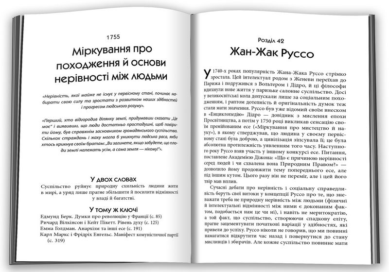 Книжка «50 видатних творів. Політика» дає уявлення про твори провідних лідерів від Авраама Лінкольна й Вінстона Черчилля до Маргарет Тетчер, а також про твори, які змінили уми людей і світ. Вона охоплює часовий проміжок у 2500 років, правих і лівих, мислителів і діячів, економістів (Мансур Олсон) і активістів (Саул Алінський), воєнних стратегів (Клаузевіц), лідерів зі стратегічним мисленням (Сунь Ятсен), філософів свободи (лорд Актон, Ісая Берлін, Роберт Нозік), пропагандистів ідей лівих (Жан-Жак Руссо, Емма Голдман, Мері Волстонкрафт) і консервативних (Едмунд Берк). Також у ній розглядається лібералізм — політична філософія, що наголошує на особистій свободі як найвищій цінності разом з відкритими суспільствами й ринковою економікою.