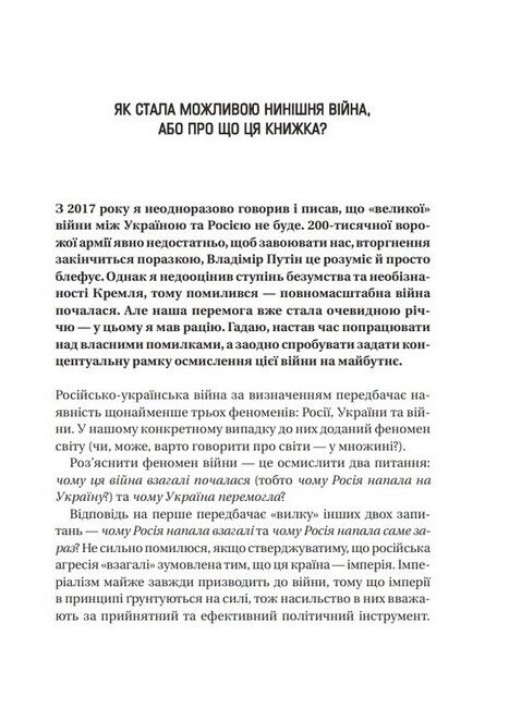 Росія програла нинішню «велику» війну – у цьому немає сумнівів. Бойові дії ще триватимуть, але своїх стратегічних цілей в Україні Кремль вже ніколи не досягне. То чому ж ця війна взагалі стала можливою і чому Москва вірила у свій блискавичний успіх на полі бою? Яке значення має Україна для Путіна особисто та Росії в цілому? Звідки взялися міфи про «ісконно русскій» Крим та «один народ»? Чим закінчиться війна і яке майбутнє чекає на Росію та Україну?