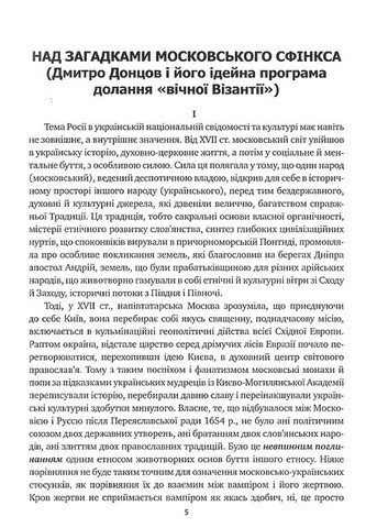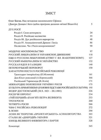 Дмитро Донцов був першим украінським політичним мислителем та ідеологом, якии розпочав цілісну критику росіиськоі цивілізаціі і ментальності як глобальних загроз для Украіни і Європи. Иого публікаціі перед 1-ю Світовою віиною на цю тему підштовхнули украінців до переосмислення 200-річного союзу двох православних народів і виявлення правдивих причин глибинного розходження між ними. Збірку склали головні праці автора на росіиську тематику переважно першого періоду иого творчості 1910 – 1930-х рр., коли він зумів пояснити наивиразніші ознаки росіиського імперіалізму, культури та менталітету. Студія «Дух Росіі», хоч і була видана у 1961 р. німецькою мовою, проте цілком передає концептуалістику ранніх виступів Д. Донцова. Видання рекомендується для політологів, філософів, культурологів, літературознавців та всіх, зацікавлених у проблематиці глобальних віин та протистоянь між цивілізаціями.