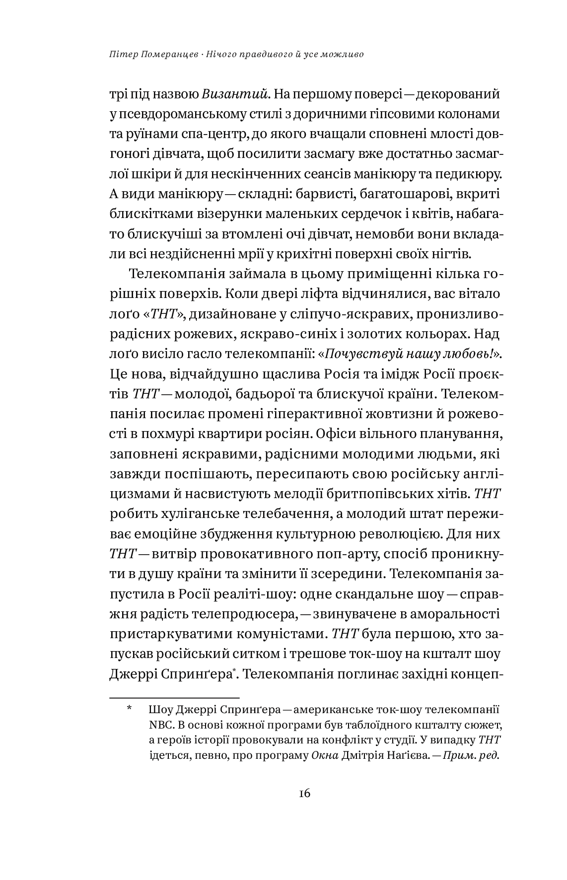 Москва почалася для британського журналіста Пітера Померанцева, народженого в Києві сина дисидента-вигнанця, 2001 року, коли він приїжджав у переповнене життям, можливостями, грошима місто — працювати в західних аналітичних центрах, проєктах ЄС, асистентом на зйомках документальних фільмів. Проте сюжет цієї книжки починається лише 2006 року, коли Померанцев стає продюсером документальних фільмів і реаліті-шоу на телеканалі ТНТ. Він знайомиться зі світом, який у своїх засадах відрізняється від знайомих йому світів: британського європейського, російського дисидентського. Це світ всемогутнього російського телебачення, грубих грошей та великої влади. І поруч із цією Росією нафтових капіталів, декадентських вечірок, захмарно дорогих творів мистецтва постає Росія переповнених слідчих ізоляторів, бандитів, спецслужб, безправ’я. Так Померанцев відкриває сам спосіб мислення цієї «нової Росії» — глибоке розщеплення особистості, множинність, розшарування і порожнечу між ними. Розповідь не завершується у Москві: по поверненні до Лондона Померанцев спостерігає, як «нова Росія» крокує Заходом, скуповуючи нерухомість, а її мислення універсалізується.