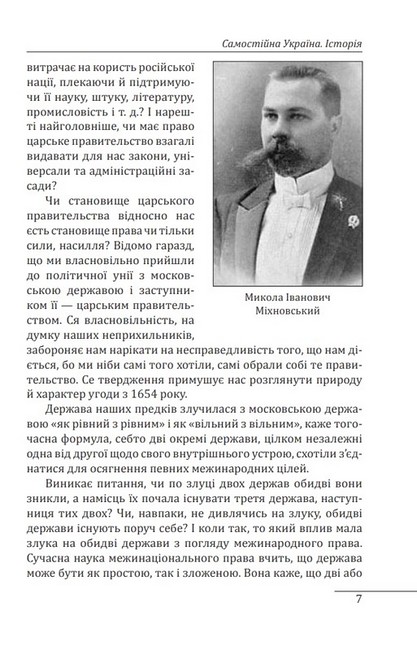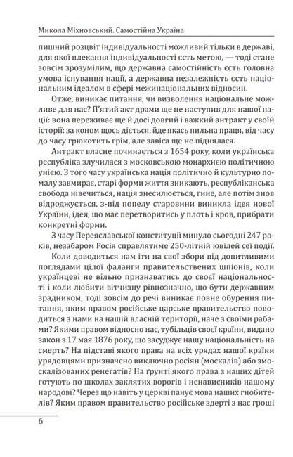 Микола Іванович Міхновський (1873–1924) — український політичний і громадський діяч кінця XIX — початку XX ст. Його брошура «Самостійна Україна», написана 1900 року, якийсь час виконувала роль політичної програми Революційної української партії. Вперше праця була видана у Львові 1900-го. Твір торкається політичних, правових і філософських аспектів буття української нації та держави. Його значну частину становив екскурс до історії русифікаторської великодержавної політики царизму. Автор вважав за необхідне і правомірне повернення до статусу України, що існував на основі Переяславського трактату 1654 року. З позицій міжнародного права він блискуче проаналізував відносини України з Росією, які мали стати конфедеративними, але були згодом односторонньо порушені Росією. Це давало право Україні на відмову від союзу з Москвою і повернення до статусу самостійної держави.