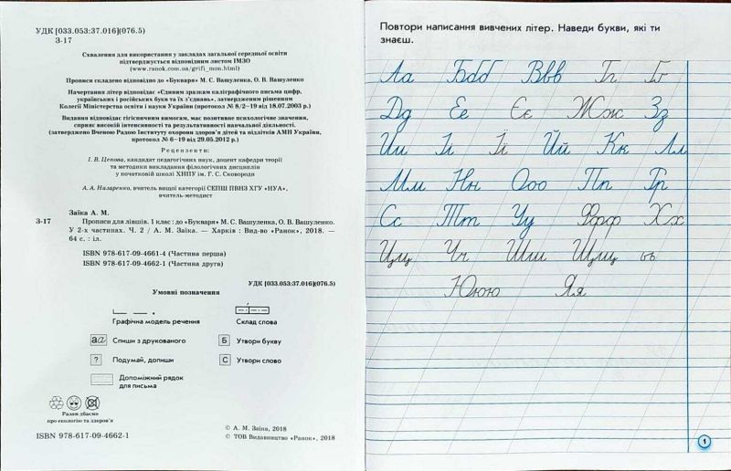 Прописи для лівшів 1 клас 2 Частина До букваря Вашуленка М. НУШ Авт: Заїка А. Вид: Ранок