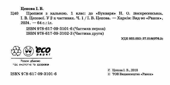 Нова українська школа прописи з калькою складено відповідно до Букваря Н. О. Воскресенської, І. В. Цепової.