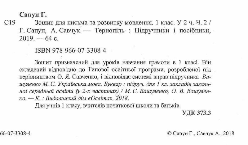 Зошит для письма і розвитку мовлення 1 клас Частина 2 До букваря Вашуленко М. НУШ Авт: Сапун Г. Вид: Підручники і посібники