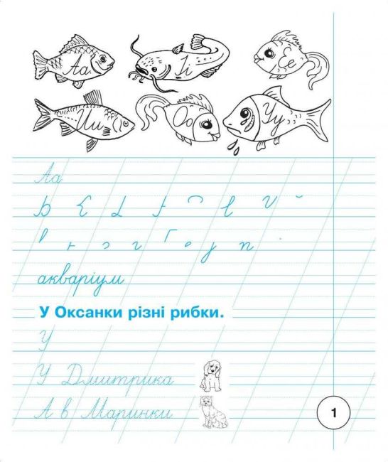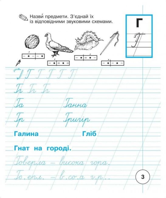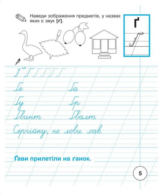 Для закріплення навичок каліграфічного письма подано різні варіанти з’єднань уже вивчених букв, зразки написання окремих слів, а також слова й короткі речення друкованим шрифтом для списування. Малюнки, із зображенням предметів, у назвах яких є букви, що вивчаються , сприятимуть збагаченню словникового запасу маленьких школярів, служитимуть матеріалом для побудови звукових схем слів, допоможуть у складанні речень чи зв’язної розповіді.