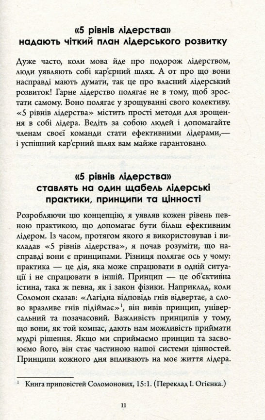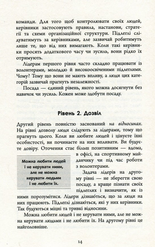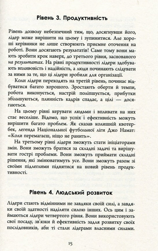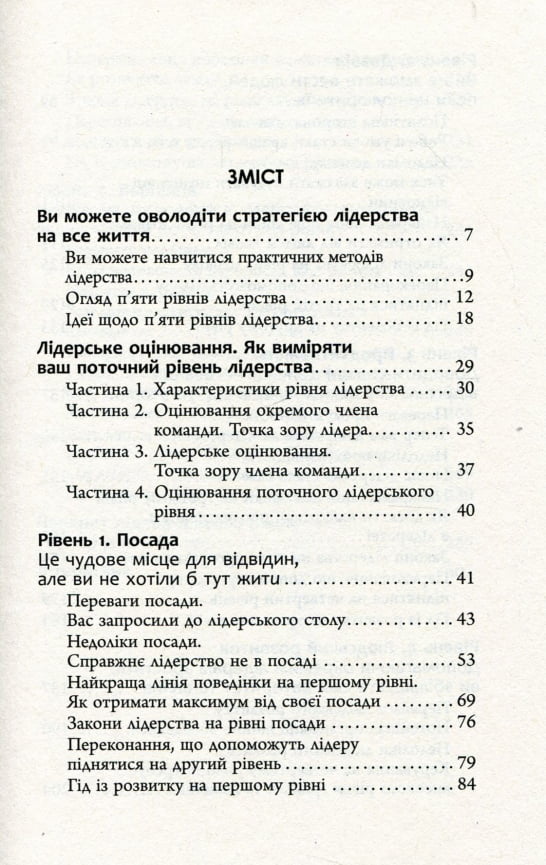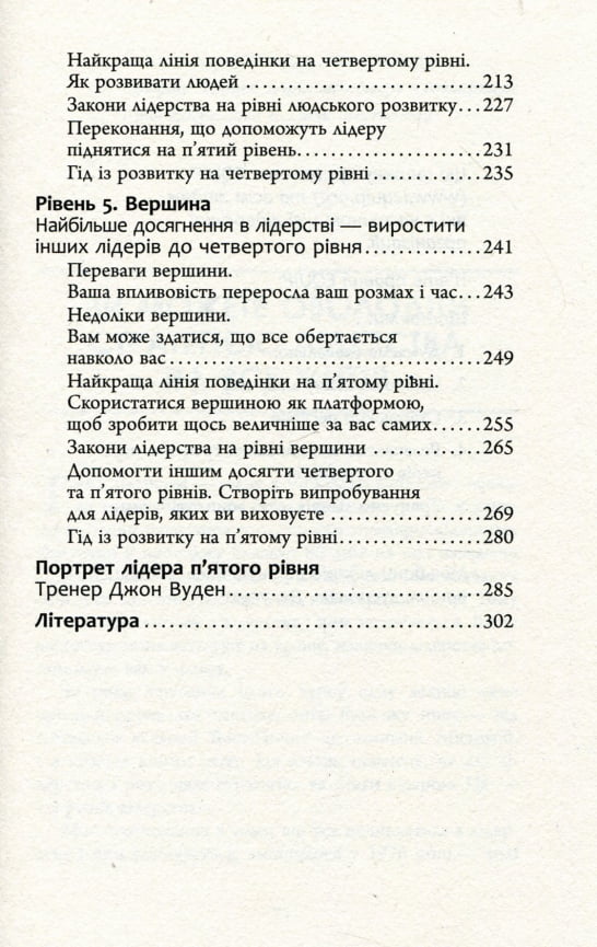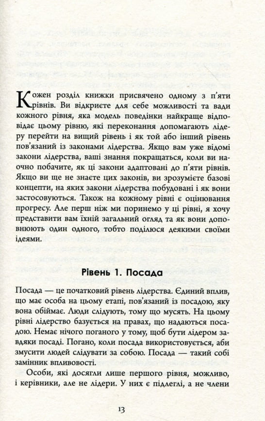 Кожен розділ книжки присвячено одному рівню: можливості й недоліки, найкраща лінія поведінки і переконання, які допоможуть піднятися на наступний щабель, зв’язок того або іншого рівня з загальними законами лідерства