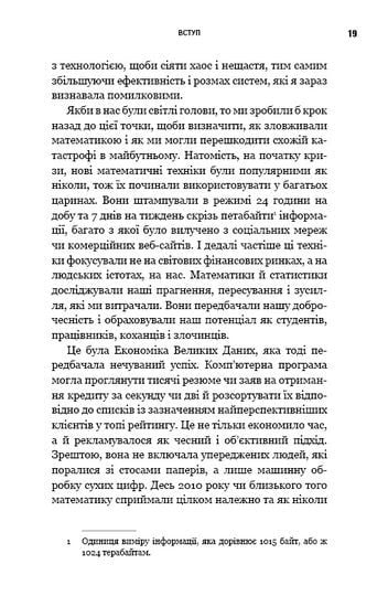 Ми живемо в епоху алгоритмів. Рішення, які впливають на наше життя, дедалі частіше ухвалюють не люди, бо їх визначають математичні моделі. Це має забезпечити справедливість рішень, позаяк кожного судять за одними й тими самими правилами, і упередженість зводять нанівець. Проте Кейт О’Ніл розкриває в книзі інший бік Big Data і математичних алгоритмів ухвалення рішень. Моделі, які застосовують нині, є непрозорими, нерегульованими й беззаперечними, навіть коли явно помиляються. Вони здатні посилювати дискримінацію. Приміром, бідний студент не може отримати позику, позаяк модель кредитування вважає його занадто ризикованим (з огляду на його поштовий індекс), тим самим його позбавляють можливості здобути гарну освіту, яка може витягнути його з бідності. Математичні моделі допомагають сильнішим, натомість карають слабких, створюючи «токсичний коктейль для демократії». Ласкаво просимо на темний бік Big Data.