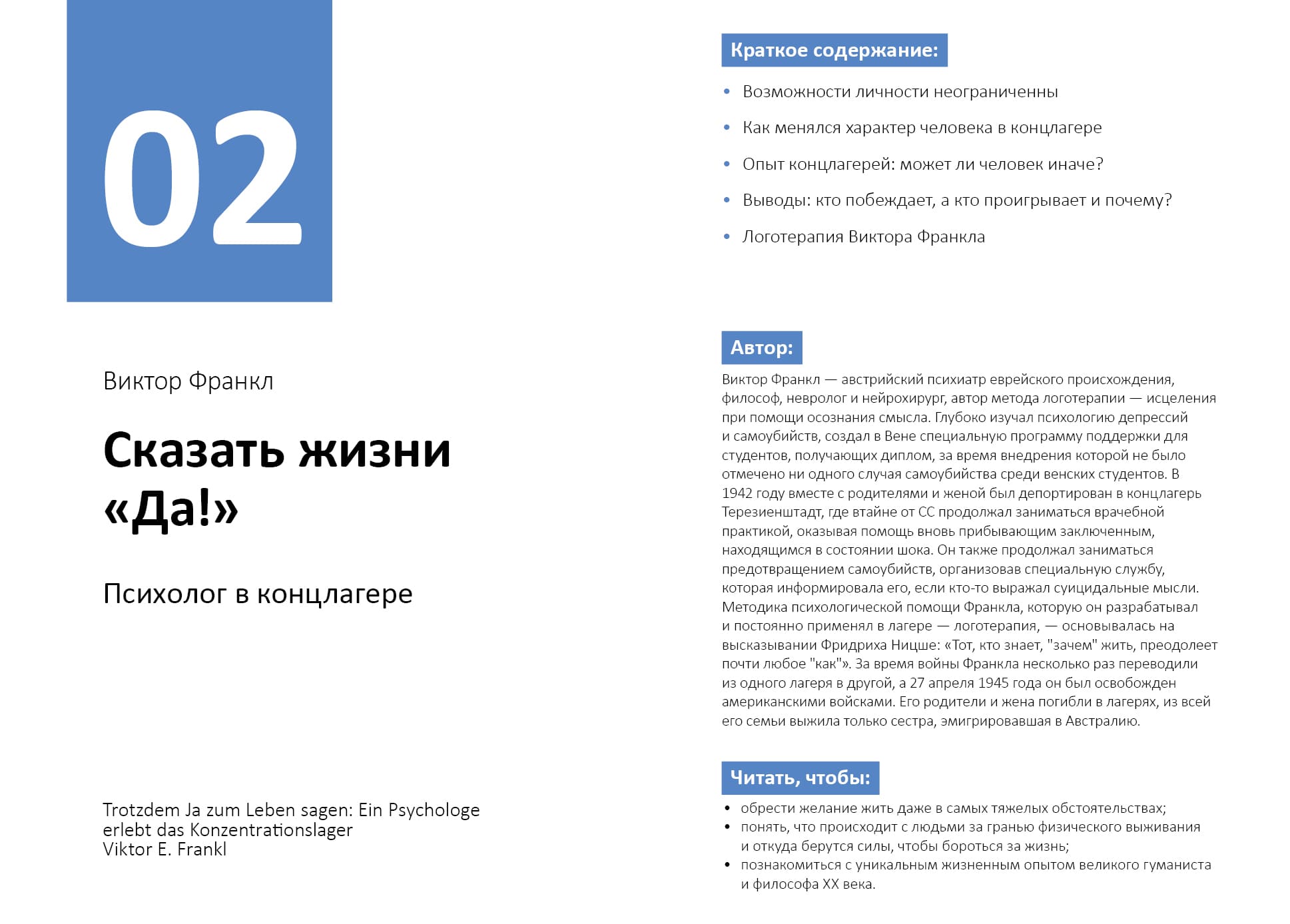 - «Сказать жизни «Да!» Психолог в концлагере» Виктора Франкла