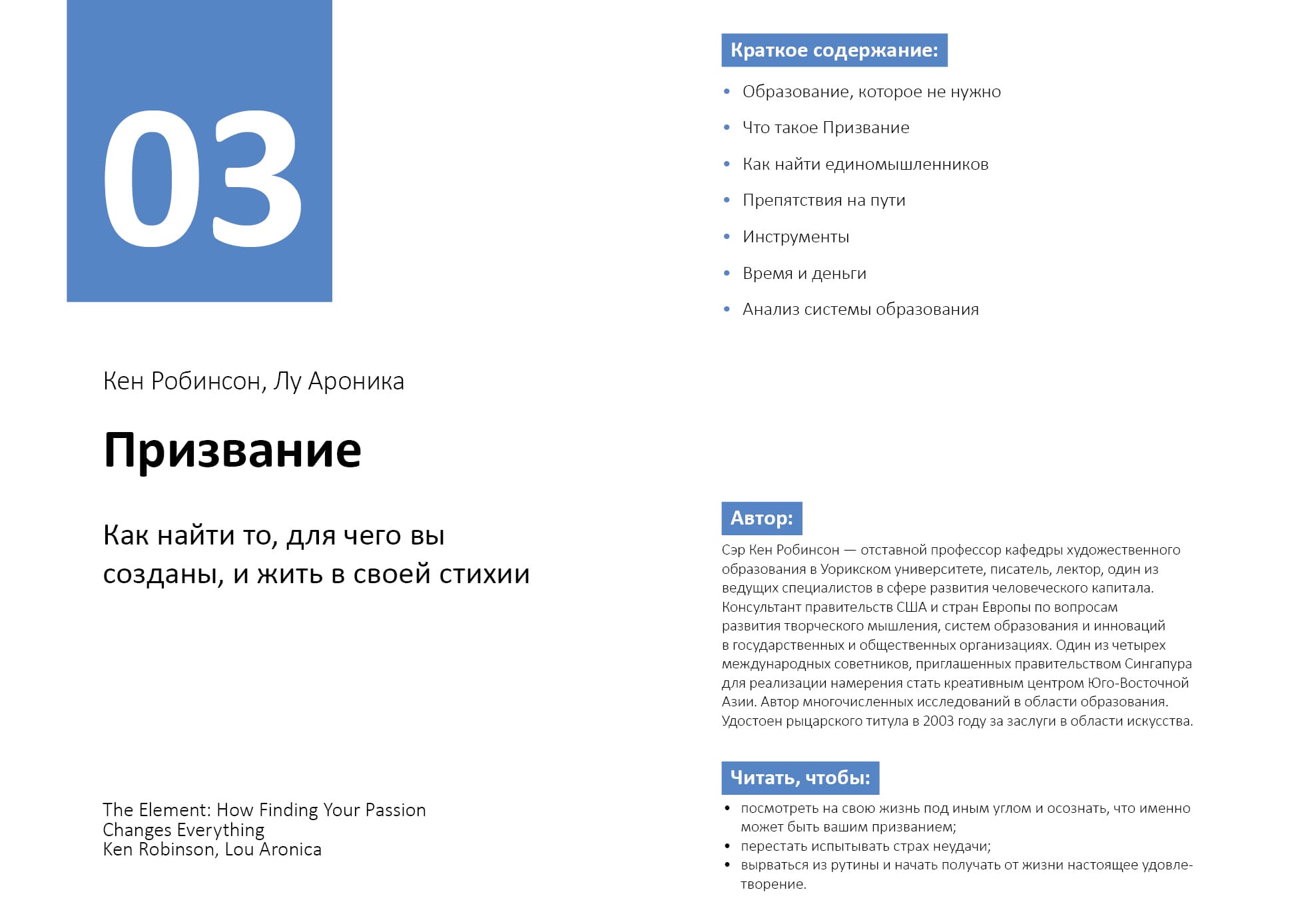 - «Призвание. Как найти то, для чего вы созданы, и жить в своей стихии» Кена Робинсона, Лу Ароники