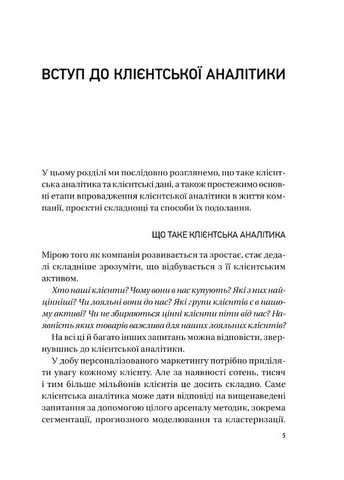 \nДо помочі стане ця книжка, що пропонує: прості та ефективні інструменти клієнтської аналітики; практичні методи та стратегії оптимізації маркетингових зусиль і підвищення прибутковісті; досвід Airbnb, Amazon, Netflix та інших лідерів ринку. Час перетворювати власні дані на цінні знання, приймати обґрунтовані рішення, адаптуватися до змін і перемагати конкурентів. Розвивайте бізнес через глибоке розуміння клієнтів!