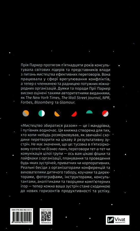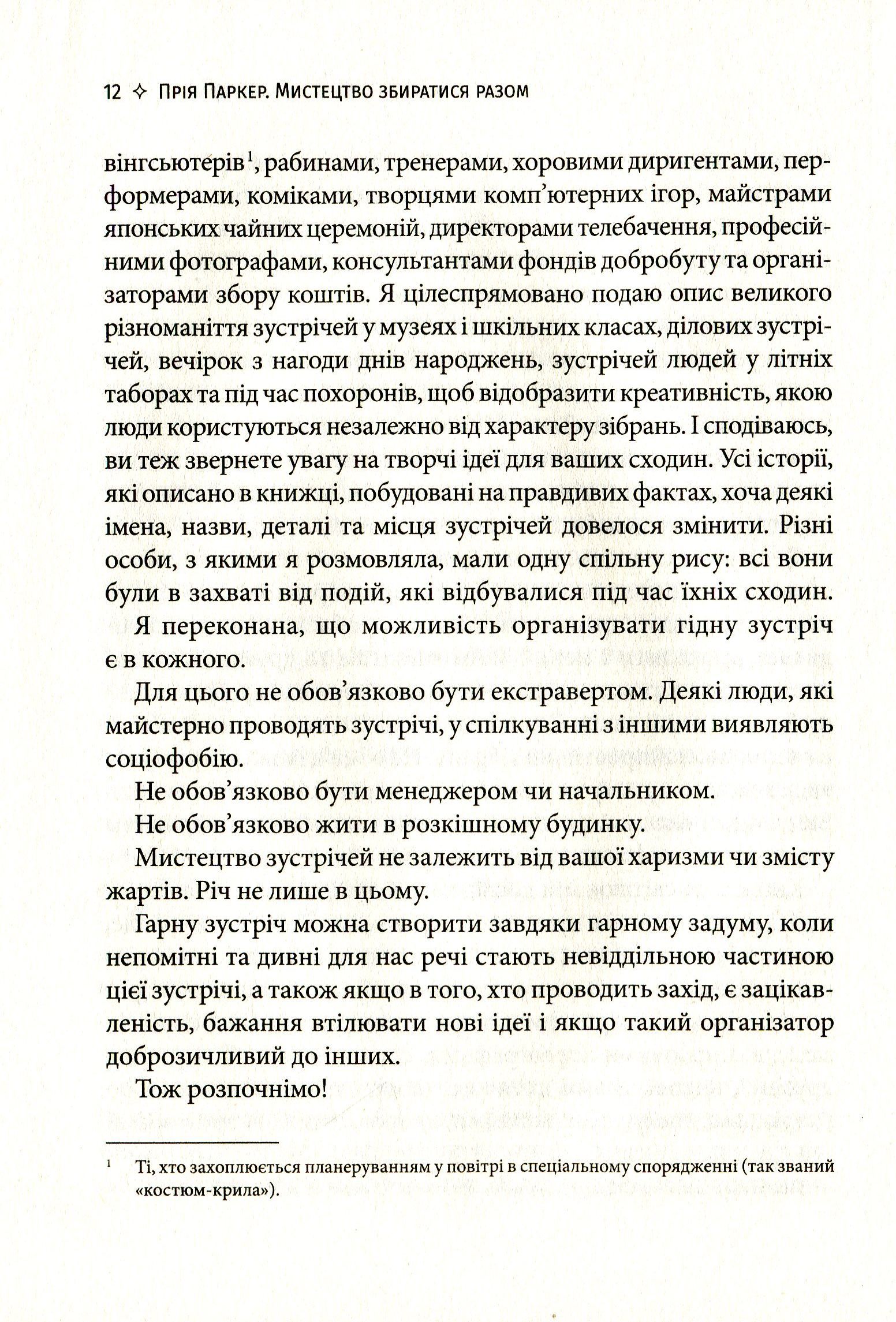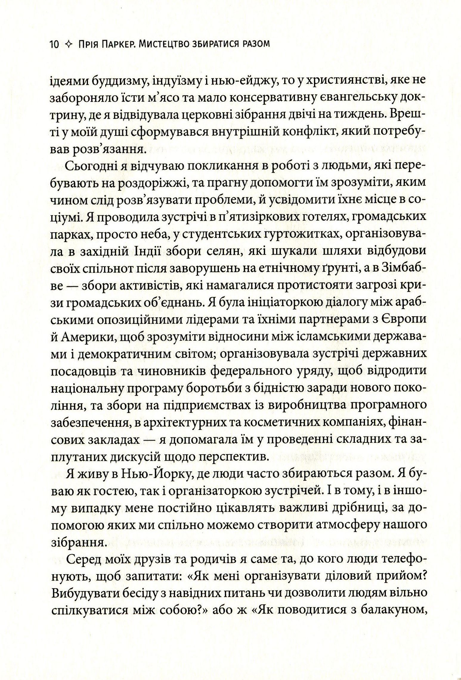 «Мистецтво збиратися разом» — це і мандрівка, і путівник водночас. Ця книжка створена для тих, хто коли-небудь розмірковував, як звичайні сходини перетворити на цікаву й результативну зустріч. Не має значення, що це — тусовка у п’ятизірковому готелі чи бізнес-зустріч, переговори "тет-а-тет" чи комунікація цілої групи.