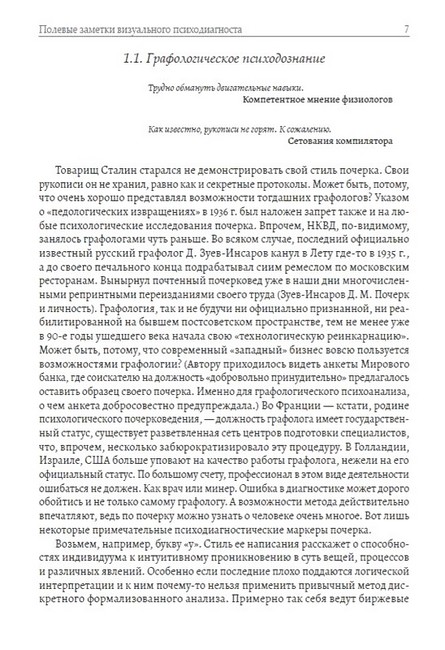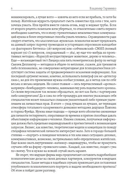 Книга «Полевые заметки визуального психодиагноста» написана Владимиром Тараненко, знаменитым специалистом по визуальной диагностике человека, автором оригинальных методик, эффективно используемых в бизнесе, HR, рекламе, разнообразных сферах межличностной коммуникации. В своей книге автор делится сведениями, позволяющими установить психотип человека и предугадать особенности его реакции и поведения по разрозненным и весьма специфическим данным: от внешности, мимики и пространственной ориентации до… стилевых особенностей ненормативной лексики и алкогольных предпочтений пьющего субъекта. Особую ценность представляют предложенные автором оригинальные методики по выявлению скрытого манипулирования, применяемого людьми при деловом общении. Владимир Тараненко не только объясняет специфику манипуляционных методик, но и позволяет подобрать методы противостояния им. Книга будет полезна всем, кто стремится стать высокоэффективным менеджером и предпочитает действовать нестандартно.