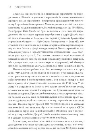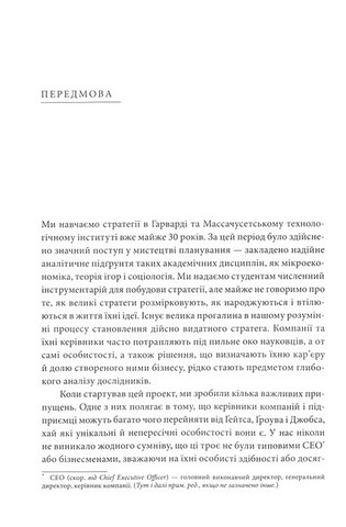 \nЯк стають видатними стратегами? Ґейтс, Ґроув і Джобс були першими «бізнес-зірками» у сучасному світі технологій. Аналізуючи їхній тридцятирічний досвід управління компаніями сукупною вартістю в 1,5 трильйона доларів — Microsoft, Intel та Apple, — автори цієї книжки сформулювали п’ять основних правил, що виявилися спільними у стратегічному плануванні цих гігантів ринку та дозволили випередити конкурентів, які цими принципами нехтували. Саме ці правила допомогли стільниковому телефону iPhone далеко посунути індустріальних гігантів Nokia та BlackBerry, крихітній компанії Microsoft із Сіетла взяти гору над своїм головним замовником — на той час найдорожчою у світі компанією IBM, а майже збанкрутілій фірмі Intel здолати японців, корейців та європейців у боротьбі за світове лідерство в новій революційній технології — виробництві мікропроцесорів.