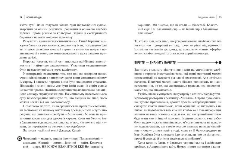 Щодня мозок отримує й засвоює візуальну інформацію, яка впливає на наші споживацькі рішення. Часто ми купуємо товар лише тому, що дізналися про його існування, а тепер хочемо мати «ту штуку з реклами» вдома. Перехід від «бачу» до «хочу» відбувається швидко та несвідомо. Так, сучасним брендам відомі наші тайнощі. Але ми можемо перехитрити їх, опанувавши сліпобачення — здатність бачити невидиме в споживчому світі. Відтепер питання, чому ми купуємо непотріб, не риторичне. Ви навчитеся відділяти контекст від поведінки, вибиратися з пасток незворотних витрат й опануєте довгострокове планування. Досить бути пасажиром у власному літаку, станьте головним пілотом, щоб обирати напрям руху в споживчому світі без «золотих пропозицій» та «унікальних акцій».