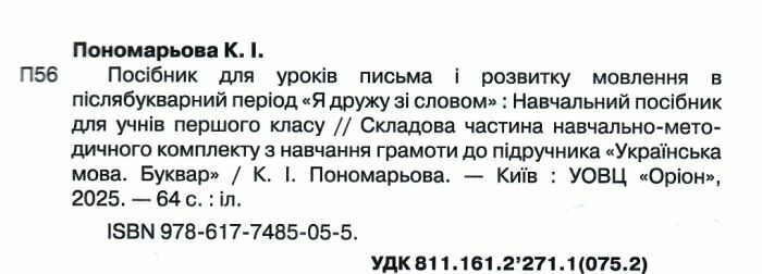 Посібник для уроків письма і розвитку мовлення в післябукварний період Дружи зі словом 1 клас НУШ Авт: Пономарьова К.І. Вид-во: Оріон 112108