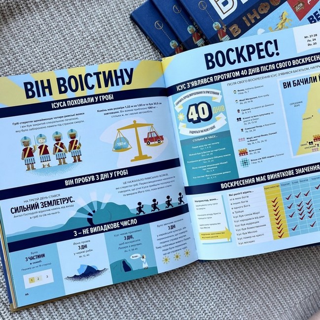 «Біблія в інфографіці для дітей» – це перша книжка такого формату від видавництва «Свічадо». Задум авторів геніальний і водночас простий: розповісти дітям про важливі біблійні події так, щоб їх було легше зрозуміти і навіть уявити. Інфографіка пригодилася у цій справі якнайкраще.