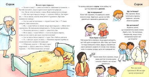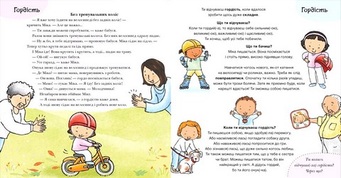 - Кожен розворот - це: повчальна міністорія; кілька порад до ситуацій, пов'язаних із темою; окрема тема, присвячена почуттю або відчуттю, з яким дитина краще познайомиться, опрацювавши розворот.