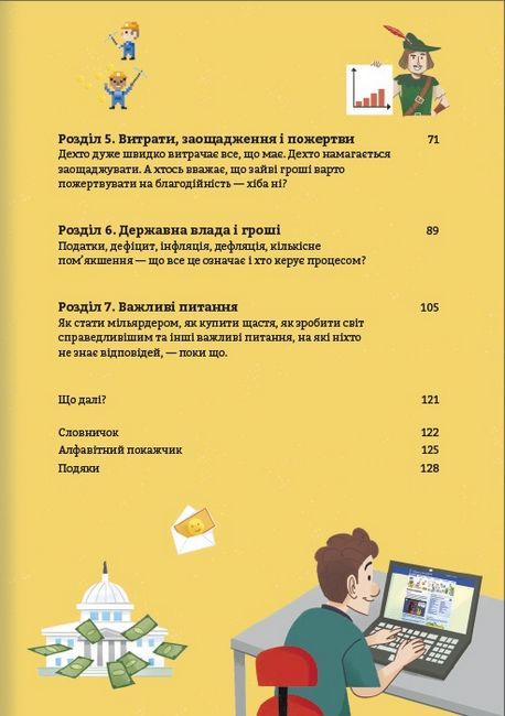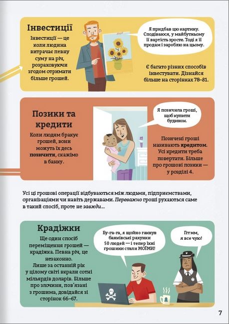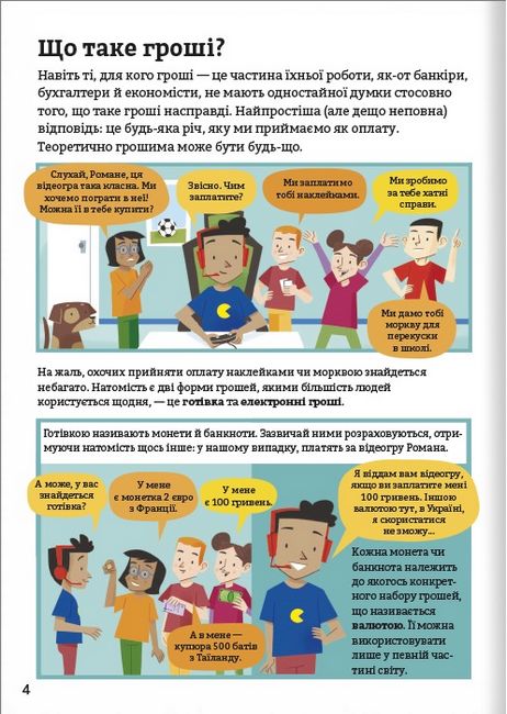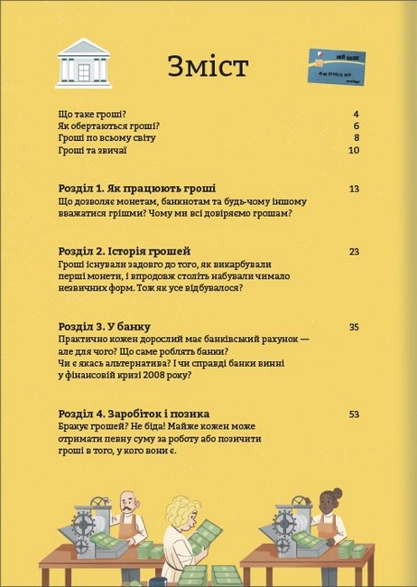 Автори подають матеріал доступно. Через цікаві факти, інфографіку та приклади з життя вони пояснюють, які є способи заробити гроші, що таке кредити, які є способи оплати, що таке інвестиції і в чому цінність грошей. А ще – що таке валюта, е-гроші, що таке борг і як його можна сплатити, як працюють банки і навіщо вони людям, чи що таке трудовий договір чи бюджет.