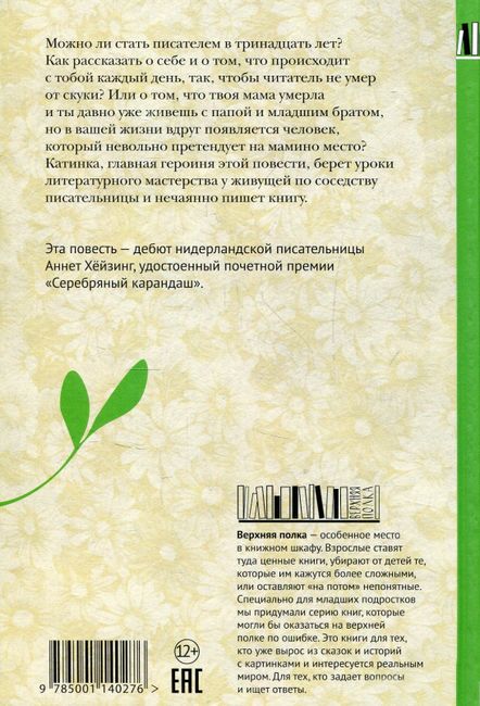 Можно ли стать писателем в тринадцать лет? Как рассказать о себе и о том, что происходит с тобой каждый день, так, чтобы читатель не умер от скуки? Или о том, что твоя мама умерла, и ты давно уже живешь с папой и младшим братом, но в вашей жизни вдруг появляется человек, который невольно претендует занять мамино место? Катинка, главная героиня этой повести, берет уроки литературного мастерства у живущей по соседству писательницы и нечаянно пишет книгу. Эта повесть - дебют нидерландской писательницы Аннет Хёйзинг, удостоенный почетной премии "Серебряный карандаш" (2015).