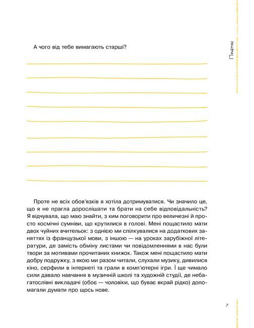 У книжках про дорослішання для дівчат бракує реальних життєвих порад: як прийняти своє тіло, домовитися про що завгодно з батьками, вибрати професію, стати впевненішою у власних силах. Книжка, яку ти тримаєш, виправить таку прикрість.