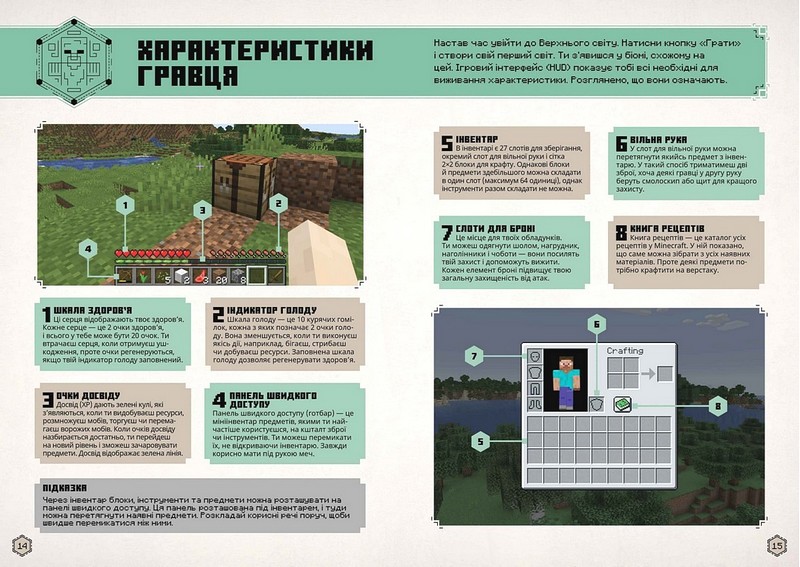 - у довіднику зібрані підказки й коментарі від самих розробників гри, які допоможуть юним геймерам застосувати можливості Minecraft на повну