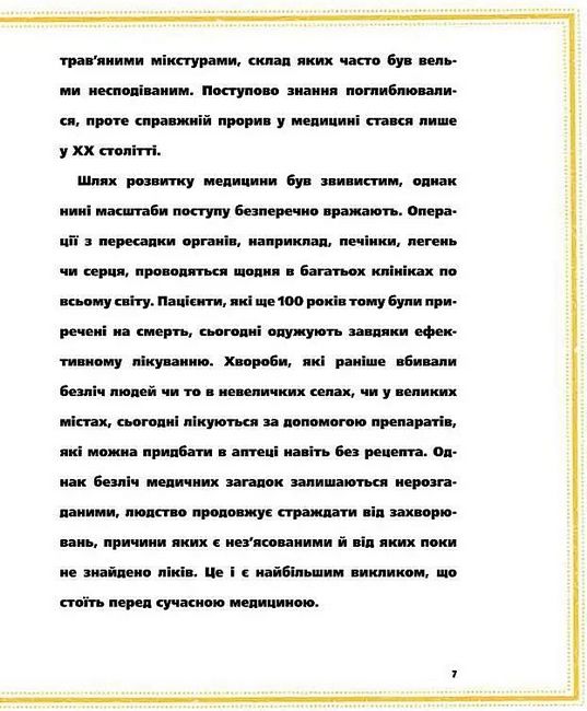 Медицина завжди була присутня в житті людини. І в давнину, і тепер медики експериментували, порівнювали, досліджували й часто ризикували! Ця книжка розповість вам про найважливіші етапи становлення медицини та епохальні відкриття як у світі лікарських засобів, так і методів чи інструментів.