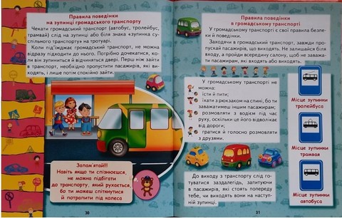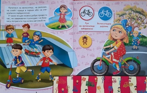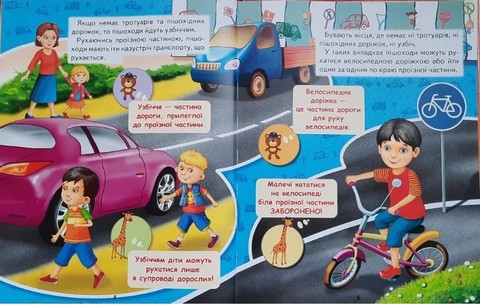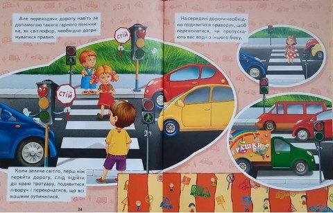 Книга розповідає про такі важливі аспекти, як переходження дороги на пішоходному переході, правильне користування велосипедом чи роликовими ковзанами, використання світлофора та знаків дорожнього руху. Кожне правило супроводжується яскравими ілюстраціями та простими поясненнями, що допомагають малюкам зрозуміти й запам'ятати правила безпечної поведінки на дорозі.