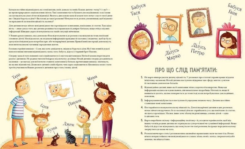 Вона неабияк допоможе вам, адже містить чітку інформацію, достосовану до можливостей розуміння кількарічної дитини. Підкаже, як тактовно розповідати про це малюкам. Спільне читання, оглядання чудових малюнків заспокоїть цікавість дитини, а батькам дозволить уникнути ніяковіння, коли син чи доня матимуть нові питання.