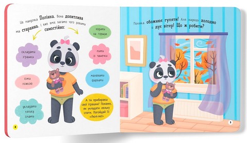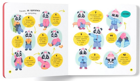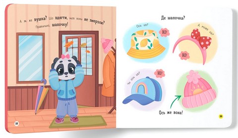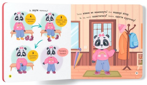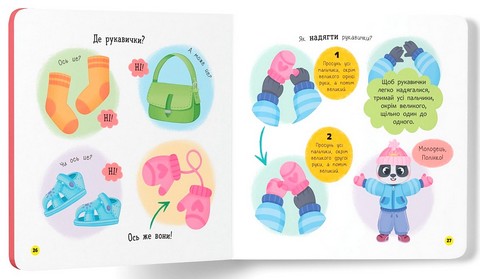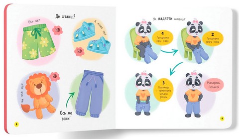 Ця інтерактивна книжка підкаже батькам, як в ігровій формі допомогти дитині навчитися вдягатися без вередувань. Разом з милим героєм ваш малюк засвоюватиме важливі навички, запам’ятає правильну послідовність дій: щоб одягти штанці, треба просунути одну ніжку, потім іншу, а потім піднятися й натягнути штанці догори. І так з кожним предметом одягу. А якщо раптом не вийде з першого разу — не варто засмучуватися, треба зробити цей процес щоденним ритуалом.