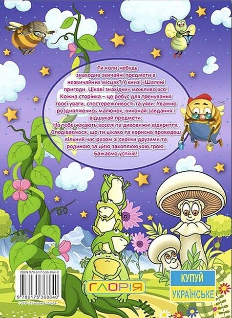 Ти коли-небудь знаходив звичайні предмети в незвичайних місцях? У книзі «Шалені пригоди. Цікаві знахідки» можливо все! Кожна сторінка – це ребус для тренування твоєї уваги, спостережливості та уяви. Уважно роздивляючись малюнок, виконай завдання і відшукай предмети. На тебе чекають веселі та дивовижні відкриття.