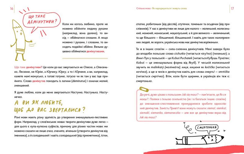 Слів у мові — як людей у народі. Котрісь із них — родичі, а котрісь навряд чи зустрінуться. Котрісь мандрують і переселяються, а котрісь — домосиди. Що ж таке усі ті демінутиви, діалектизми, пейоративи, лексичні дублети й інші загадкові звірі зі словникових нетрів? Авторка розповідає про мовне розмаїття так цікаво і з такою любов'ю, аж починаєш відчувати, як мова витанцьовує на твоєму язику.