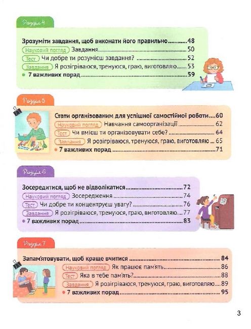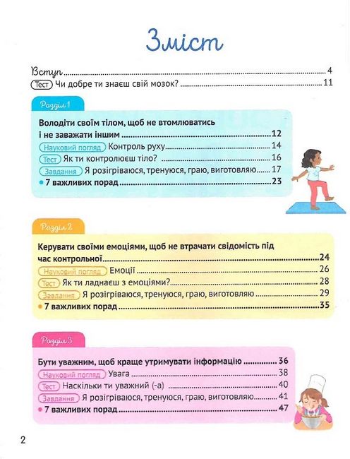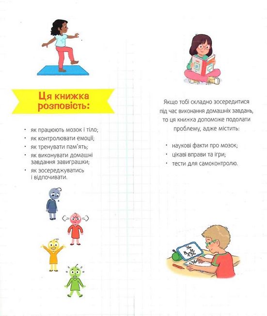 Завдяки тестам, простим вправам та іграм діти краще зрозуміють самих себе, натренують мозок, щоб легше впоратися з будь-якими шкільними завданнями.