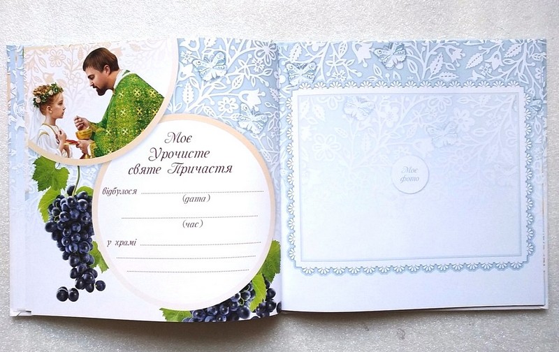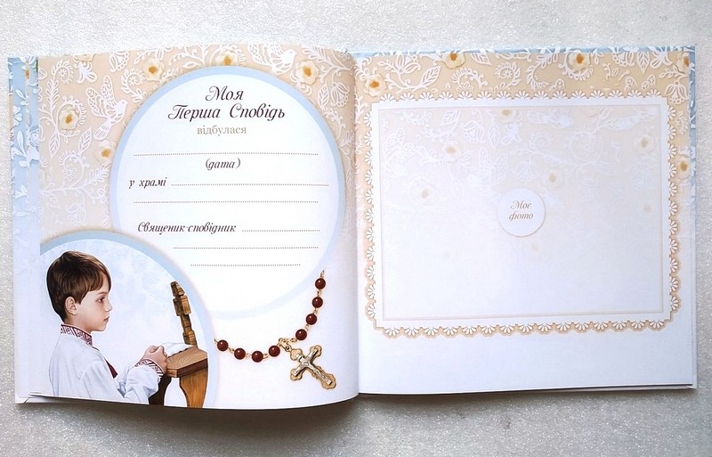 Cвятковий альбом для того, щоб залишити на згадку урочисті моменти першої Сповіді й святого Причастя.