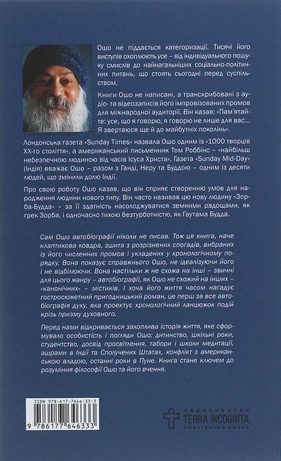 Перед нами відкривається захоплива історія життя, яке сформувало особистість і погляди Ошо: дитинство, шкільні роки, студентство, досвід просвітлення, табори і школи медитації, ашрами в Індії та Сполучених Штатах, конфлікт з американською владою, останні роки в Пуне. Книга стане ключем до розуміння філософії Ошо та його вчення.