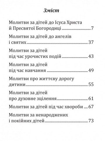 У молитовнику подано молитви за дітей (рідних, похресників, онуків, сиріт, ненароджених, покійних) у різних життєвих ситуаціях, звернені не лише до Господа Бога й Пресвятої Богородиці, праведного Йосифа Обручника, а й до ангелів-хоронителів, святих покровителів дітей...