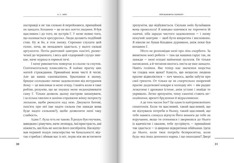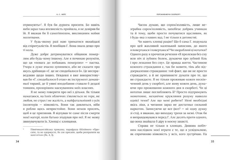 Цю книжку К. С. Люїс, знаменитий письменник, учений і мислитель, написав після смерти своєї коханої дружини, з якою йому судилося прожити лише 4 роки. Як апологет християнства, Люїс раніше писав про втрати і страждання, але одна річ – теоретично міркувати, і зовсім інша – переживати самому. Люїс ділиться тим, як він переживає свою скорботу, які питання ставить Богові й до яких висновків доходить.
