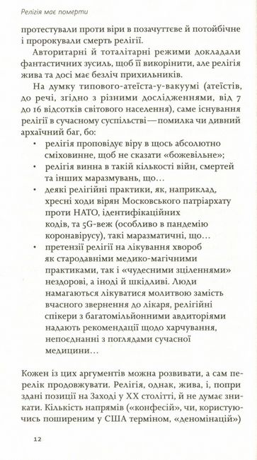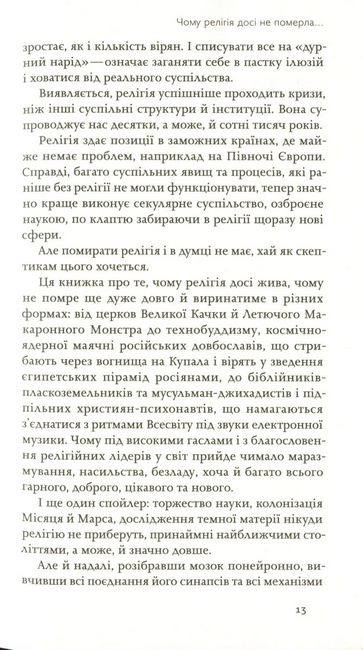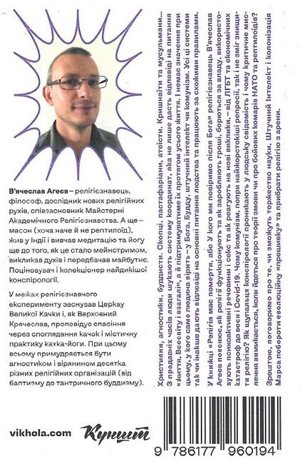 У книжці «Релігія має померти, або У кого ми повіримо після Бога» релігієзнавець В’ячеслав Агеєв пояснює, як релігії функціонують та як заробляють гроші, борються за владу, використовують психоактивні речовини і секс та як реагують на нові виклики, — від ЛГБТ та економічних катастроф до воєн і Сovid-19. Чому комунізм, попри найжорстокіші репресії, так і не зміг знищити релігію? Як щупальця конспірології проникають у людську свідомість і чому критичне мислення вимикається, коли йдеться про теорії змови чи про бойових комарів НАТО та рептилоїдів? Зрештою, поговоримо про те, чи зможуть торжество науки, Штучний Інтелект і колонізація Марса побороти еволюційну «прошивку» та прибрати релігію з арени.