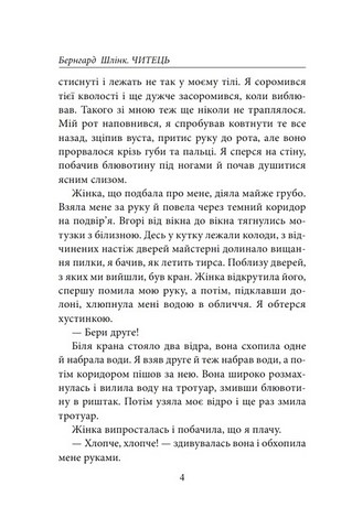 \nНаскільки великим має бути страх викриття, щоб людина зізналася в масовому вбивстві? Таке одне із запитань, які ставить Бернгард Шлінк у бестселері «Читець», події якого починаються в Західній Німеччині 1958 року. Автор розповідає про таємне кохання 15-літнього юнака та колишньої наглядачки концтабору Аушвіц, старшої від нього на 21 рік. Але згодом любовний роман перетворюється на тривалу історію про вину й сором, про моральний вибір, що змінює життя людей, про зраду, відчуження, самотність, біль...