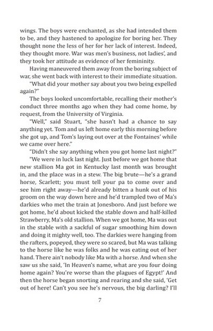 Gone with the Wind is a novel by the American writer Margaret Mitchell (1900–1949), written in 1936. In the first volume, the main character of the novel, Scarlett O’Hara, the daughter of a rich planter from Georgia—after a cloudless childhood and youth—faces difficult life challenges. Trials and poverty during the American Civil War harden her character.