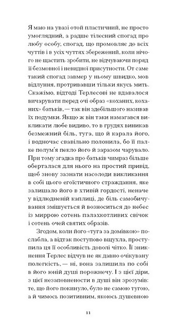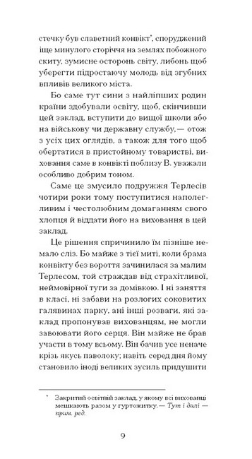 «Трапляється всяке — от і вся мудрість», — фраза, якою юний Терлес підсумовує болючий досвід пізнання себе і світу — тілесного, чуттєвого, химерного, жорстокого й імморального. Саме такого — який перебуває поза поділом на добро і зло, високе й нице, дозволене й заборонене. В освітньому закладі для хлопців життя рухається за певним порядком, і змінити його зовсім непросто.