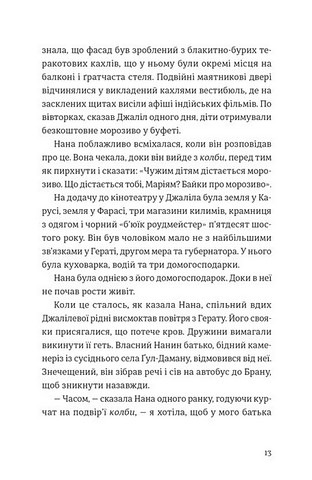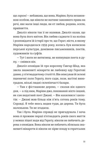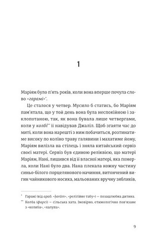\nМаріям з раннього віку засвоїла, що як стрілка компаса завжди вказує на північ, так і звинувачувальний палець чоловіка завжди вказує на жінку. А ще, що жінкам потрібне в житті тільки одне вміння, якого не вчать у школі: тагаммуль — терпіння.