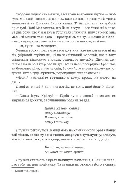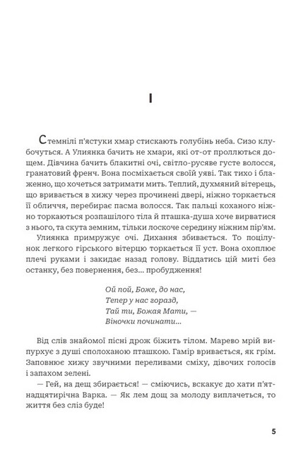 Кохання не зважає на релігійні чи етнічні розбіжності. Молода русинка- сирота і поляк-бідняк закохуються. За наполяганням родини й через особисту образу дівчина виходить заміж за іншого. Улиянка готова втекти від чоловіка до коханого, та в їх життя вривається Друга світова війна… І після важких випробувань настало ще пекельніше — «взаємний обмін населенням» за угодою між Польщею та СРСР, що для русинів став терором, депортацією і колгоспним рабством. Ця книжка хоч і номінована в рамках конкурсу «Коронація слова» як кращий роман про кохання, все ж охоплює складний історичний період, у якому попри всі незгоди кристалізується характер молодої лемкині, що готова до спротиву сваволі владців.